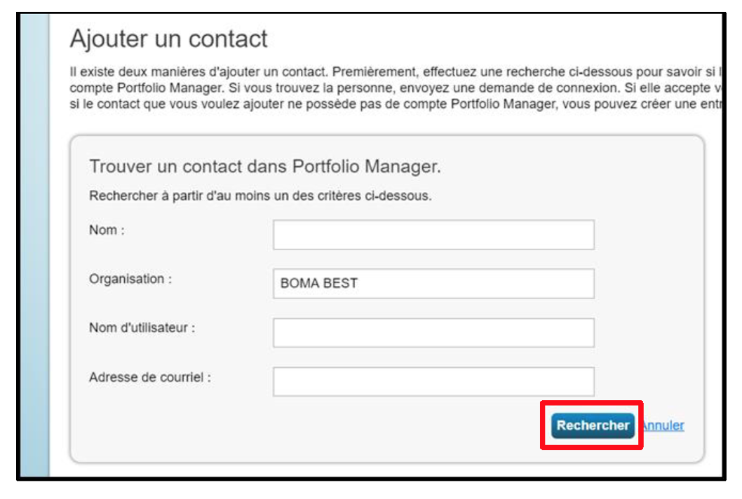4. La page ajouter un contact s’affiche. Dans la zone organisation, tapez boma best et cliquez sur rechercher.